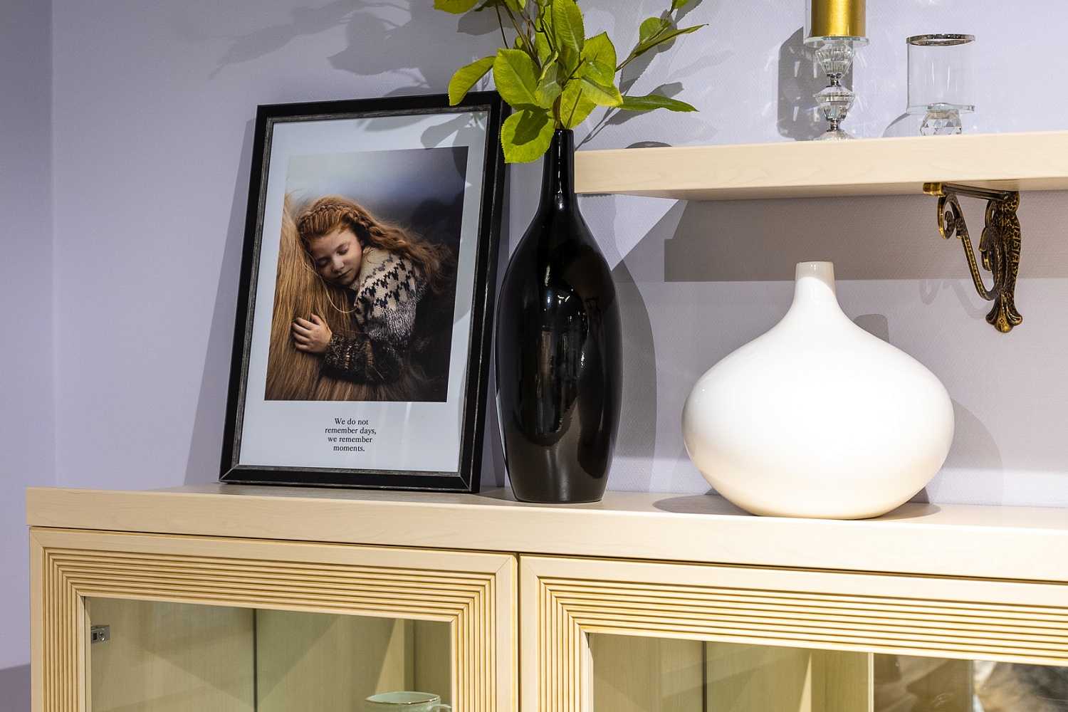 - В гостиной есть вся необходимая мебель для хранения: два напольных и два навесных шкафа, тумба с двумя выдвижными ящиками и две вместительные полки. Для самого важного всегда найдется место;