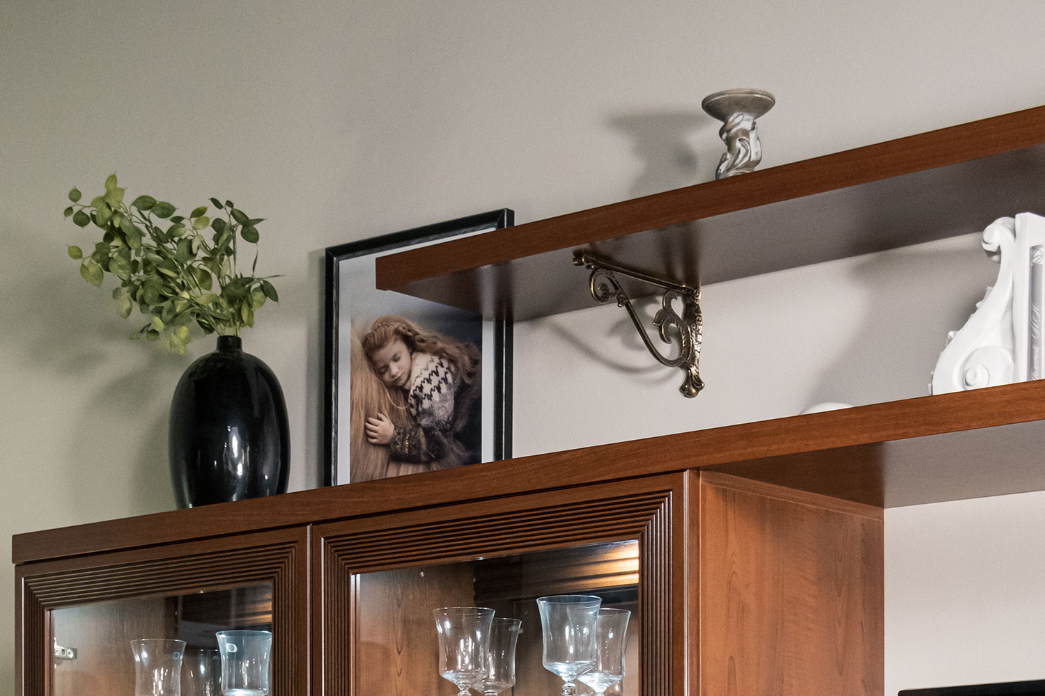 - На задних стенках шкафов со стеклянными вставками есть зеркала. Это помогает зрительно расширить комнату.