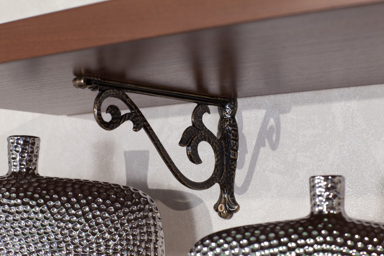 - Полка АГ-025.03 навешивается на стену на декоративных менсолодержателях (МакМарт);